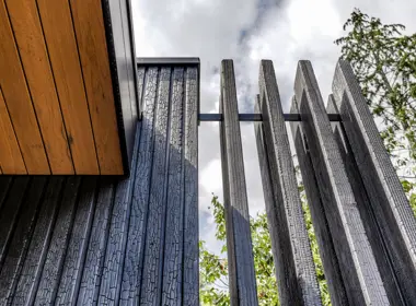 Gebruikte houtsoorten: Th. Gemodificeerd Fraké, zwarthout Maragame (accoya) en gelamineerd lariks