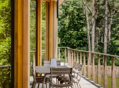 De draagconstructie bestaat uit een combinatie van houtskeletbouwelementen en kruislaaghout (CLT). Zowel de vloeren als het dak zijn uitgevoerd in CLT, waardoor grote overstekken konden worden gerealiseerd zonder gebruik van zware staalconstructies. De gevelmaterialen geven elke bouwlaag een eigen identiteit, maar samen vormen ze een evenwichtig geheel. De gevels, terrassen en balustrades zijn uitgevoerd in Fraké loofhout, terwijl de achterzijde is bekleed met gebrand hout. De gelamineerde Fraké kozijnen met triple glas zorgen voor een hoge isolatiewaarde en versterken de natuurlijke uitstraling van het ontwerp.