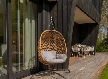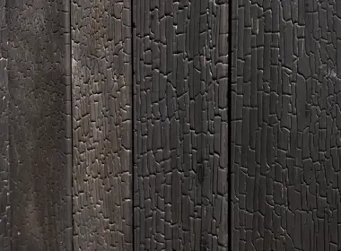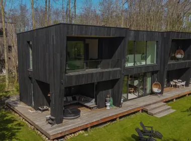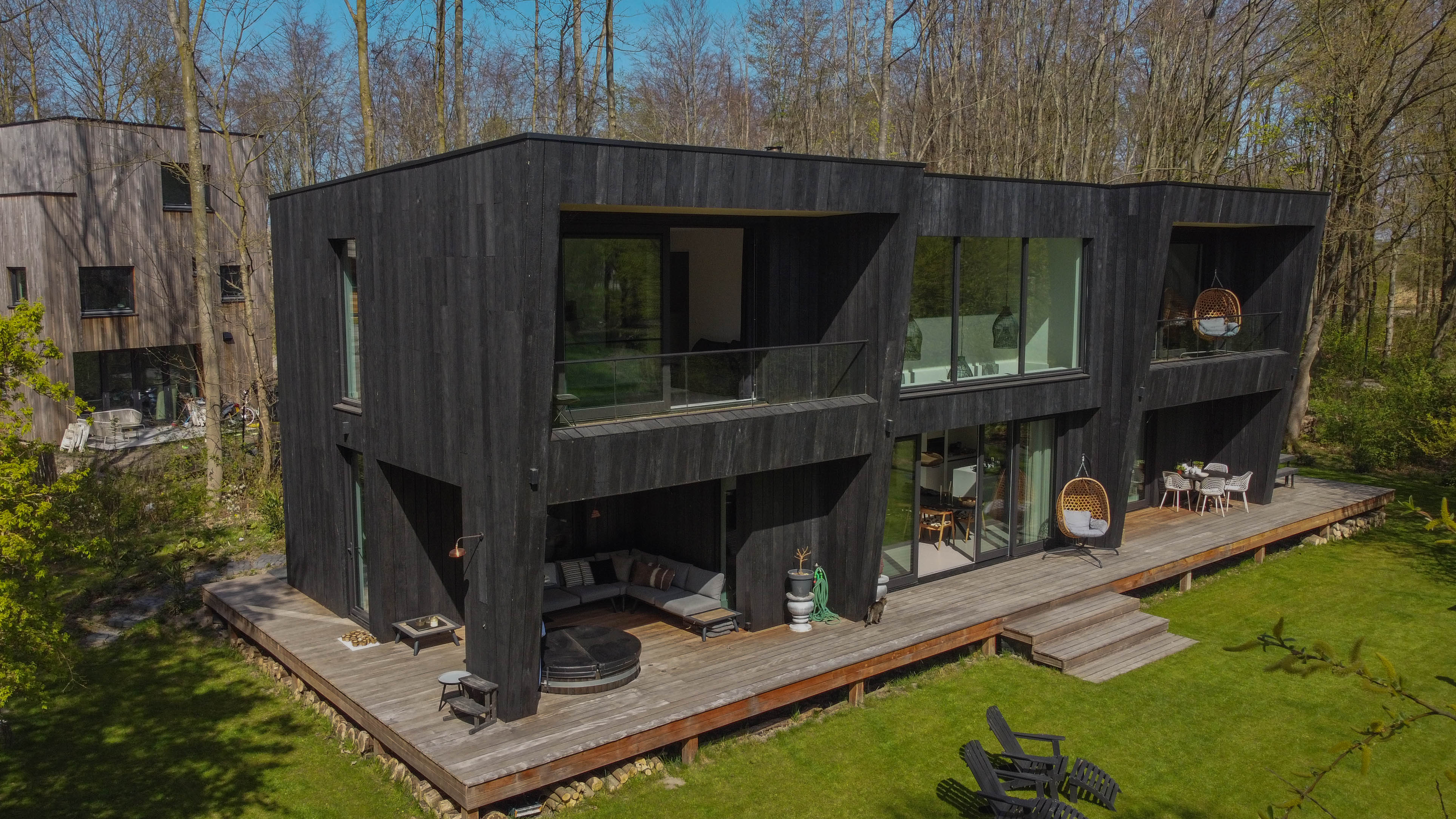 - Gevelbekleding: zwart hout, gebrand Accoya (verduurzaamd en onderhoudsvrij door verkoling)