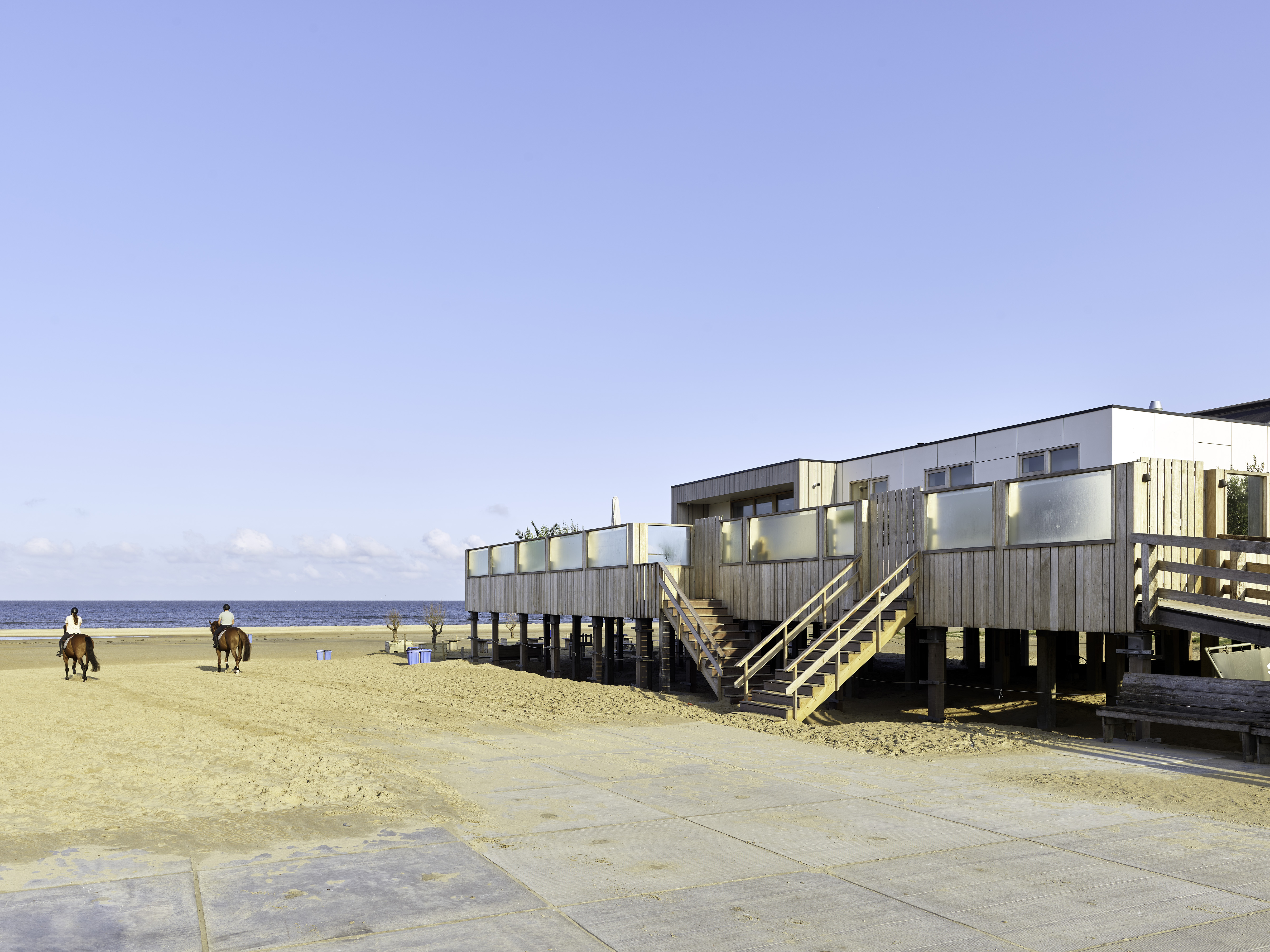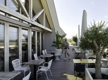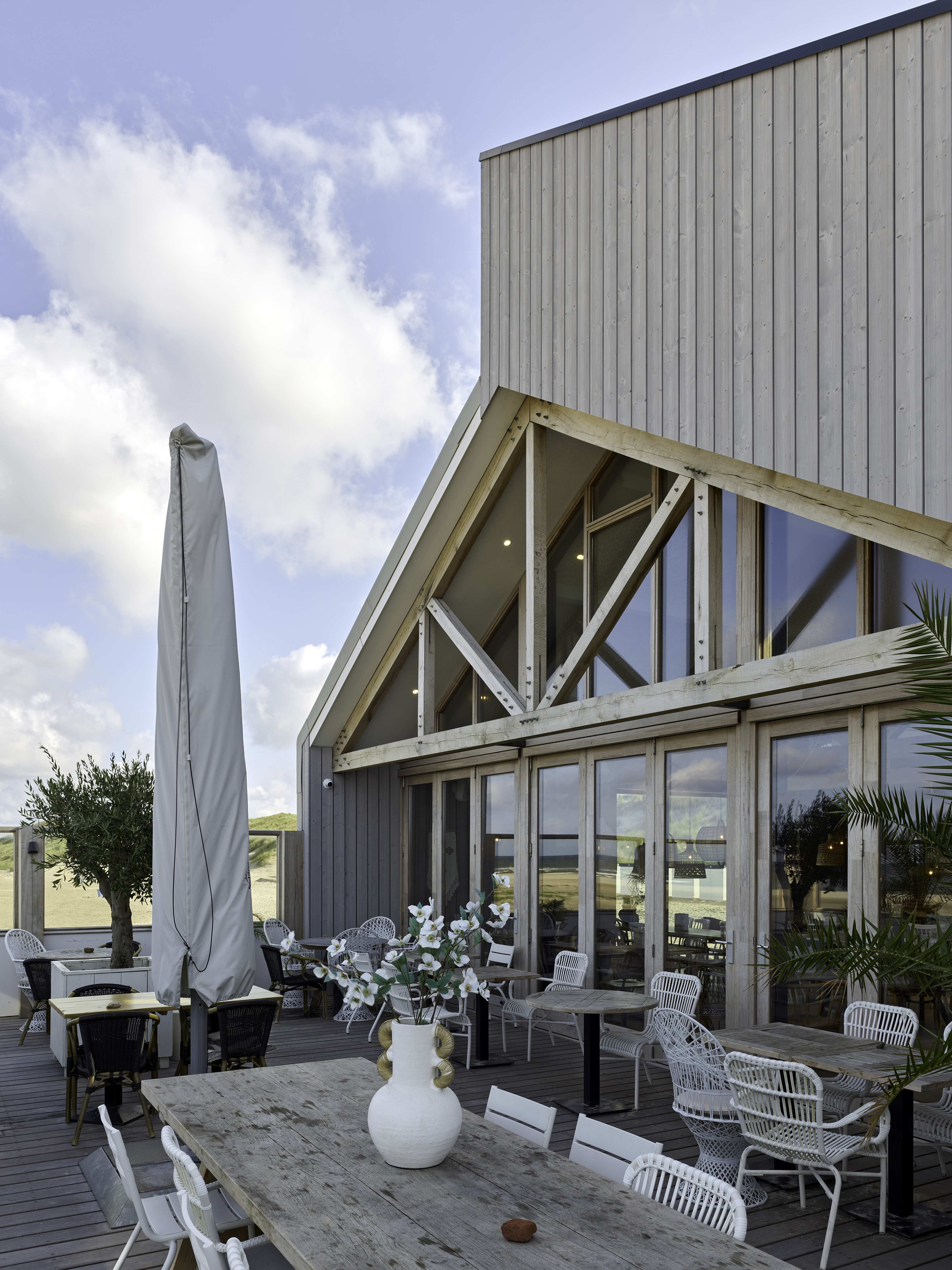 “Al sinds 2004 schrijf ik het hout van Platowood voor, het is een heel mooi materiaal. Ik vind het belangrijk dat hout duurzaam is, afkomstig uit gecertificeerde bossen. Voor het strandpaviljoen was hout een logische keuze gezien de natuurlijke uitstraling van het materiaal, passend bij de omgeving.”