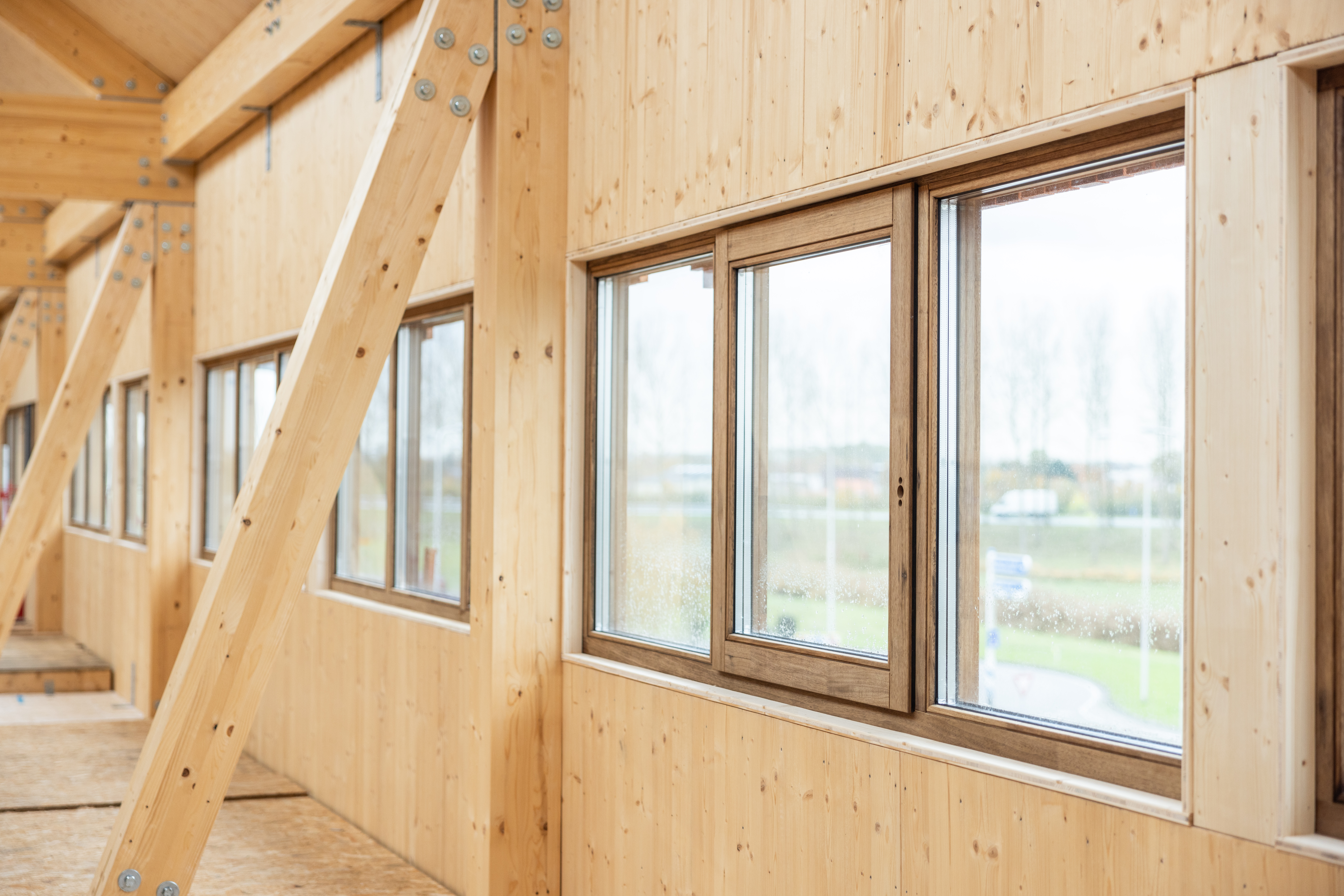 In de HSB-elementen zijn Fraké kozijnen toegepast, geleverd door Timmerfabriek BETI. Deze kozijnen zijn geheel onbehandeld en voorzien van HR+++ beglazing. Fraké is een duurzaam, stabiel hardhout dat afkomstig is uit verantwoord beheerde bossen. Door te kiezen voor dit materiaal sluit Deltawind naadloos aan bij de circulaire en biobased ambities van het project.