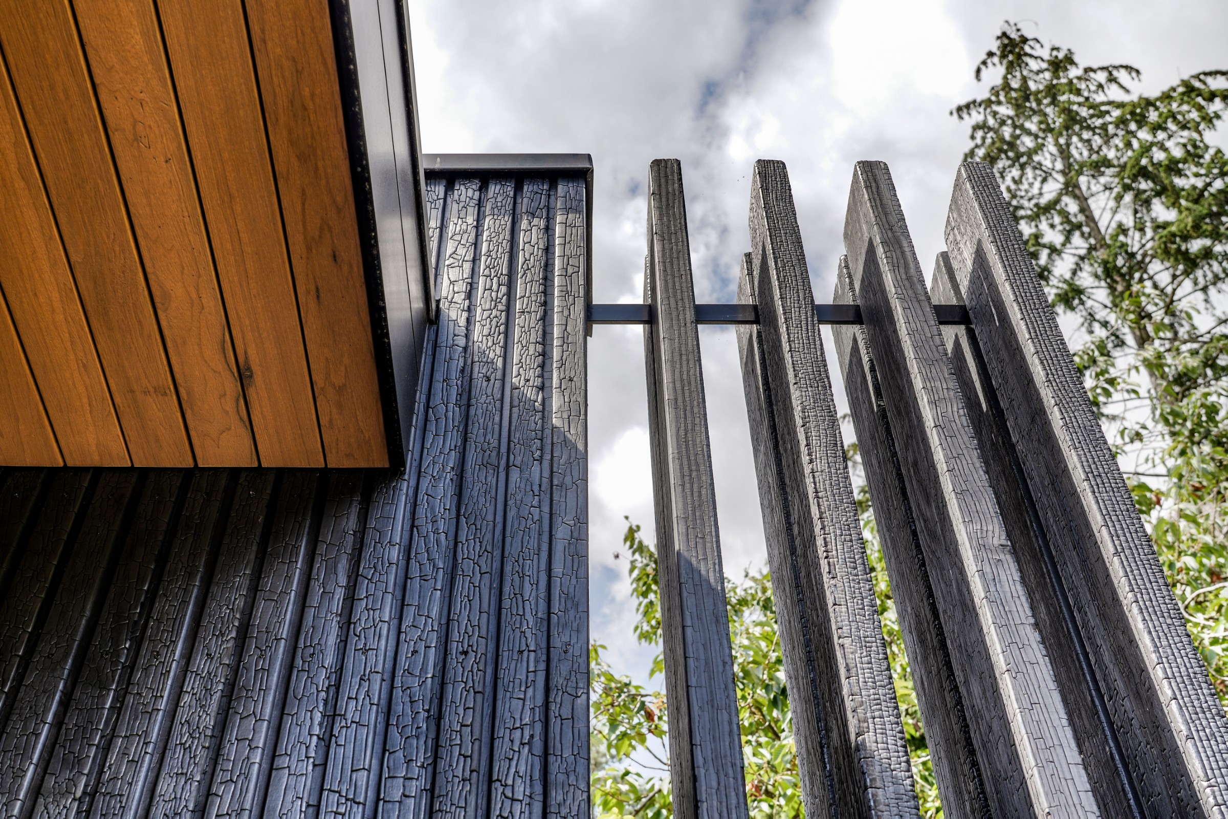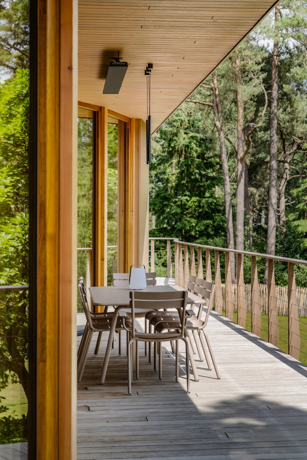 De draagconstructie bestaat uit een combinatie van houtskeletbouwelementen en kruislaaghout (CLT). Zowel de vloeren als het dak zijn uitgevoerd in CLT, waardoor grote overstekken konden worden gerealiseerd zonder gebruik van zware staalconstructies. De gevelmaterialen geven elke bouwlaag een eigen identiteit, maar samen vormen ze een evenwichtig geheel. De gevels, terrassen en balustrades zijn uitgevoerd in Fraké loofhout, terwijl de achterzijde is bekleed met gebrand hout. De gelamineerde Fraké kozijnen met triple glas zorgen voor een hoge isolatiewaarde en versterken de natuurlijke uitstraling van het ontwerp.