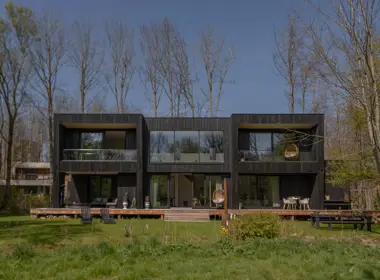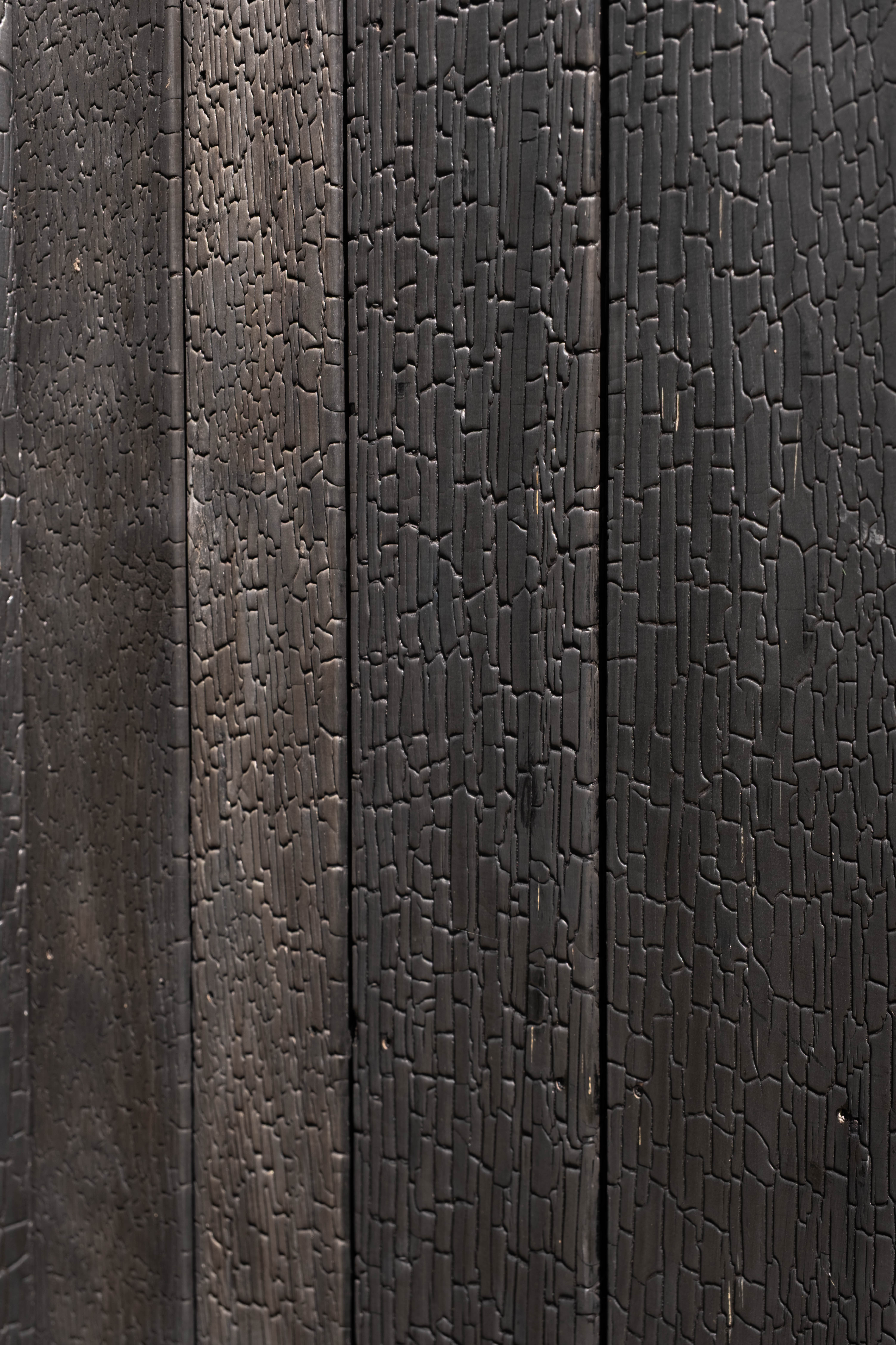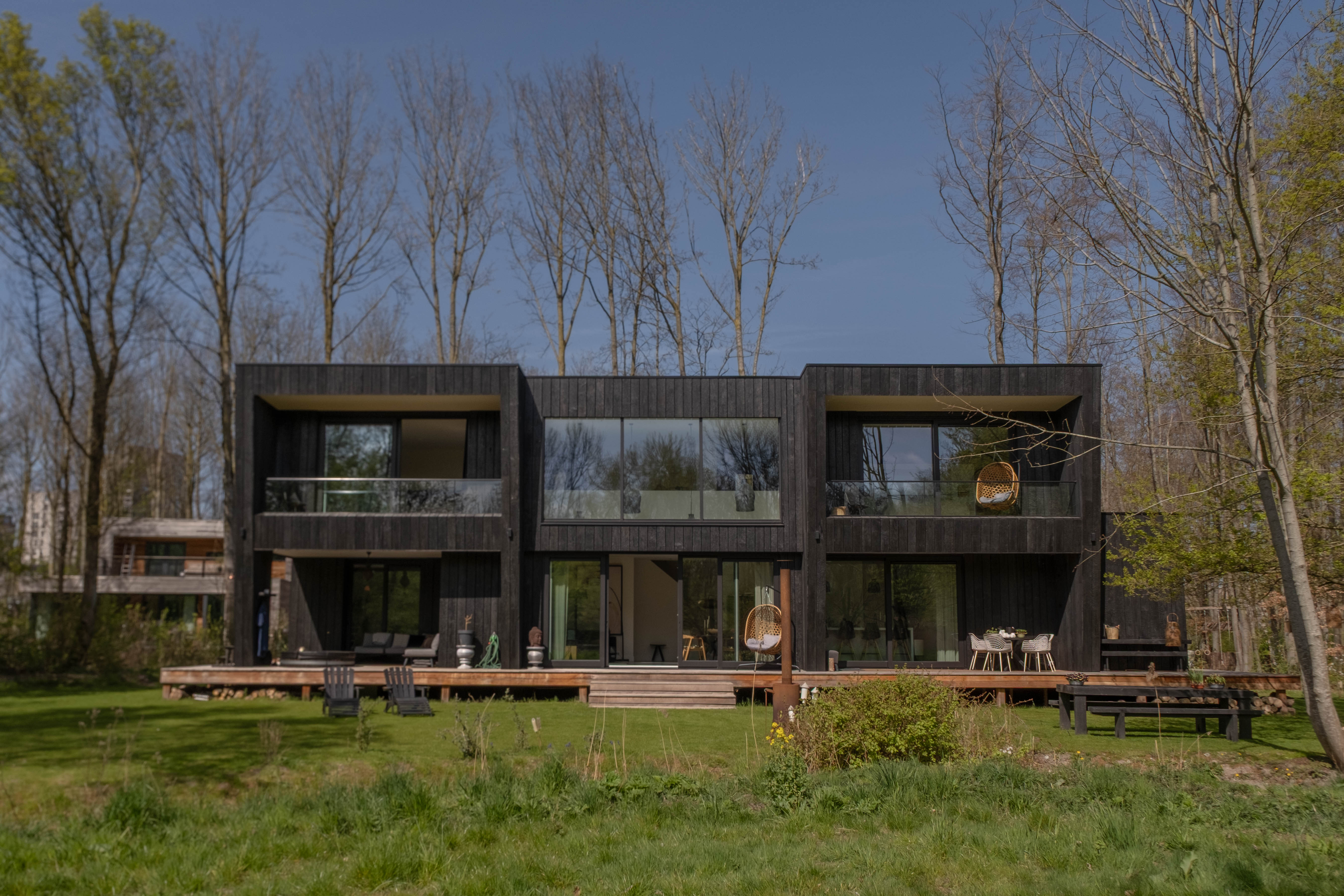 - Gevelbekleding: zwart hout, gebrand Accoya (verduurzaamd en onderhoudsvrij door verkoling)