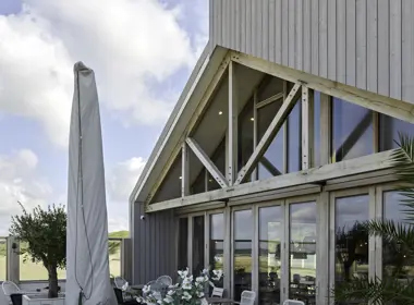 Voor de kozijnen viel de keuze op duurzaam Platowood Fraké, dat bestand is tegen het zoute kustklimaat en nauwelijks onderhoud vergt. De terrasbalustrade is afgewerkt met bijpassende geveldelen van Platowood Fraké, uitgevoerd in het Platonium 05-profiel – een verticaal gevelprofiel met open voeg dat zorgt voor natuurlijke ventilatie en een strakke belijning. Zo ontstaat een rustig en samenhangend geheel waarin hout de verbinding vormt tussen het paviljoen en de omgeving.